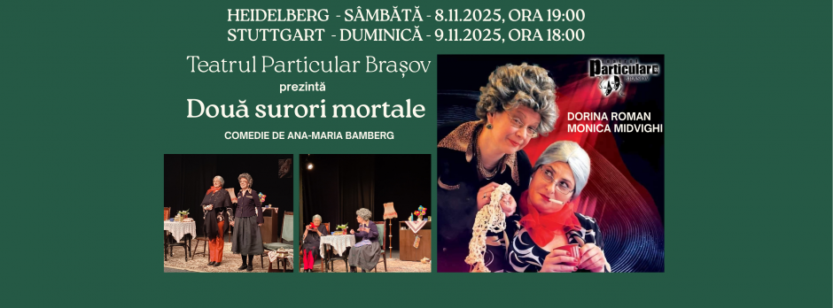 Publicul românesc din zona Stuttgart este invitat la ultimul eveniment teatral din acest an: comedia „Două surori mortale” de Ana-Maria Bamberger, în interpretarea actrițelor Dorina Roman și Monica Midvighi, producție a Teatrului Particular Brașov.