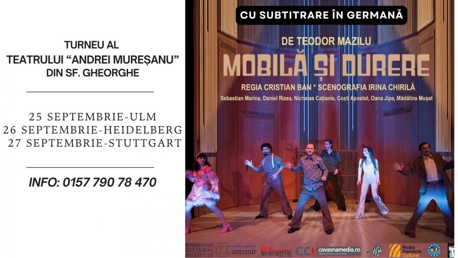 Teatrul „Andrei Mureșanu” din Sfântu Gheorghe aduce pe scenele din Ulm, Heidelberg și Stuttgart spectacolul „Mobilă și durere”, de Teodor Mazilu, în regia lui Cristian Ban. Reprezentațiile, cu subtitrare în limba germană, vor avea loc pe 25 septembrie la Ulm, pe 26 septembrie la Heidelberg și pe 27 septembrie la Stuttgart.